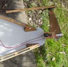 The mizzen sheet is fed through a plastic hoop on a rope attached to the rudder shaft, then through a guide and cleat on the tiller plywood attachment. It is not very clear, but the guide and cleat are visible as black objects in the photograph, and the plastic hoop can be seen hanging from the rudder by a rope that passes through the rudder shaft.