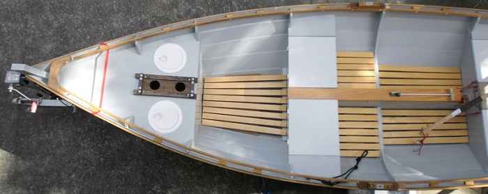 The final structural components are the floorboards, which rest on pine blocks that are glued and screwed to the bottom and bulkheads. The weight of passengers and crew is borne by the bulkheads rather than by the plywood bottom.