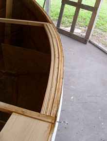Laminated 1x3 slats to a 2x4 for the bow post, back to station 3 for deck support. Additional support will be added at sta. 2. |