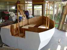 My hope is that I can hide all my goofs with glass and paint. When I started it sounded like such an easy thing to cut out the parts and stitch them together. I was not seeing how much would be required in the stitching process. That's ok; it makes a good boat.