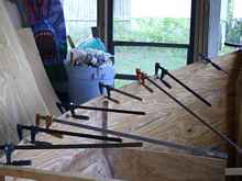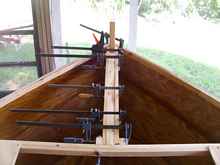 I've followed what Mike said and rolled the hull to the side. That helps with the epoxy runs and my back pain. It was easy to hoist the side with the Harbor Fright block n tackle. Slide a 2x4 under the side and support on a saw horse. This really proved to be quite stable.