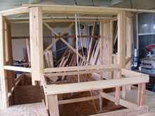I cut two 2x4"s in half then put spacers to form the two sides of what will be the cabin. I cut 22.5 deg angles in their sides to form the five sided bay window of the cabin. That proved to be too small a cabin for my needs so I increased the front window to 33 in. wide. With a height of 22 in. that will make an excellent size for the front window. The deck house extends from sta. 6 to sta. 9. Station 9 to transom will be open for bench seats.