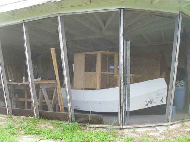 Now back to our regular program. The boat has moved! Sorry no pictures, but it was not as bad a job as I expected. It only took three men and a moderate amount of effort. Use the block and tackles to hoist on its side then pushed to the screen. Set down on its side and moved the block closer to the exit. Lift again and slide out the screen. Slide across the grass in line with the trailer, then up on the bunks.