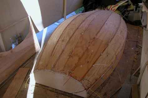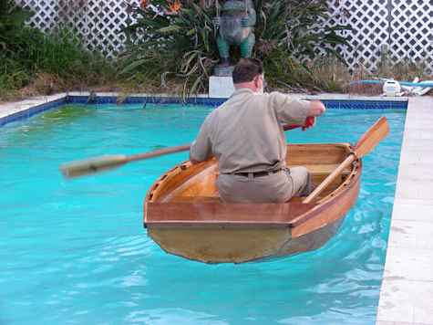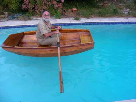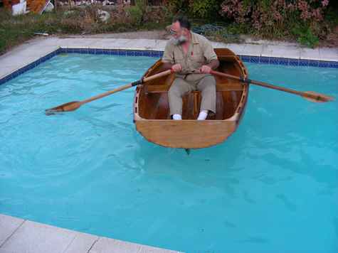 I also put a Skeg on the boat because it spun like a top under oars. With a Skeg it rows well and sails well. One thing the boat rolls quite a bit when you move around in it however the form stability is such that it stops with the gunwale about 3" above the water and won't go more. The pictures I have added of the boat in the swimming pool is when I was trying out different sizes of Skeg. The other picture was taken when I had tie wrapped the boat together and was just starting to put epoxy "Mayonnaise" into the seams. The boat was built out of A-C fir plywood then covered in one layer of 2 oz glass the epoxy was given a layer of polyurethane varnish over the top.