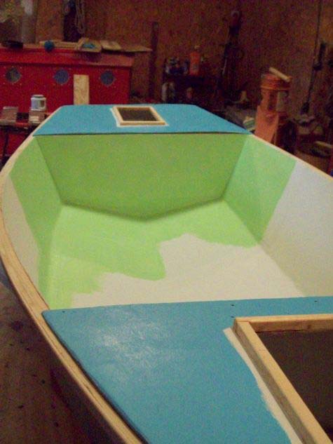 I am almost done but the fiddly bits have taken a lot longer to finish than I thought and still aren't all done. I smeared some paint on her today. I should have got some other work done to it first but couldn't wait to try this. It is suppose to be Cornflower Blue and Mint Green. The fiddly bits are going to be Mac and Cheese Orange and the wales and false stem will be black. I got the color ideas from Sandra and she approved my paint scheme. Jackie Monies mentioned to me Sandra picked out the colors on your EC entry this year so I invited her come up with something for my boat. Maybe a new service Duckworks can provide for us building nuts.