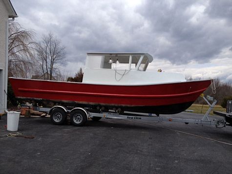 I'm at the 90% complete. It took longer than I thought due to work, travel to NJ, deer season, the new house, and life. She is 26' 10 inches tip to tip. About 1900 lbs in these photos. Power is going on in a couple weeks with a Honda 150 and Yamaha High thrust 9.9. I built to workboat style finish, meaning 100 grit max sandpaper and once around for fairing. I do not like to sand. I like to fish.