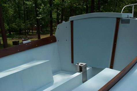 She has a 3 ½ anchor deck, 7 foot cabin with two bunks, 6 foot pilot house with a bench seat with slip top for standing at the windows. Fully opening lexan windows on a 45 inch opening, which I made so I can drive hook my arm out the window at the right height. 6'2" pilot house height max. Nine separate compartments for safety. Beach sand in the final coat of epoxy for non skid prior to painting.