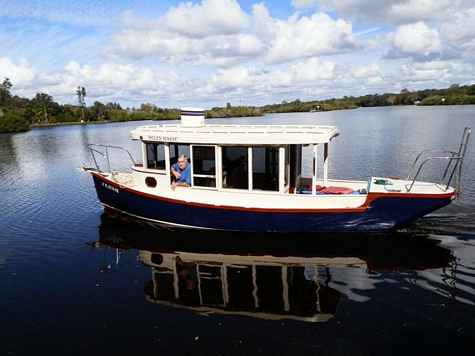 There's still work to be done on the interior but she sure is comfortable, just like sitting in your easy chair, arm out the window watching the world go by through all of the windows. Helen has all of the cushions and window shades done but I can't put um in till I'm finished making a mess. It looks like her hull speed is going to be about six knots which she can achieve at almost idle speed on the motor. This twenty gives a lot of power in reserve in case I need to tow a string of kayaks someday. Steve took some of these pictures but the really good ones were by his wife Lenna. Where did this hull design come from you ask. It's an exact blow up of Roger Allen's 15 foot Melonseed which is an enlargement of a classic 13 footer done years ago by the master Joe Leiner from up in St Michaels, Md. It also turns out to be an almost exact replica of this 1899 fantail launch that I discovered after I had the hull already built; so to save a lot of questions and wrecks on the highway I put that on the trailer.