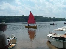 The attention to detail and imagination used to create this boat is award winning. It is a Brilliant OzRacer RV derivative with clever appropriate support from a windsurfer rig. Supports it much like a person sailing a windsurfer would. Notice the rake adjustment on the cockpit floor.