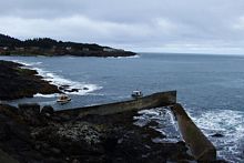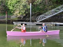 I took a few pictures of the Depoe Bay Sunday morning boaters, including the dazzling safety-pink canoe. These were from up high by the highway bridge, giving a different view.