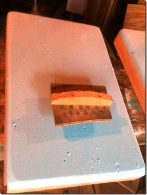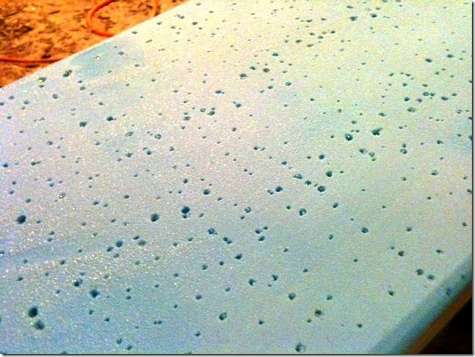 Good timing, I'm in the process of making hatch covers using blue foam right now. The blue foam is much stronger, pretty much totally water proof but it's tight, smooth surface isn't too good for sticking glass to. The epoxy sticks just fine but it's easily pealed off along with a microscopic top layer of the foam. If you glass straight onto this foam you'll later notice hand size bubbles in the cloth where something has caused the glass to lift probably due to heat. Barry did his usual detailed research and discovered that the hard, dense blue or pink foam contains a gas inside from manufacture that may come out and cause these bubbles. The white less dense foam doesn't seem to have this problem. In order to prevent that from happening you need to roughen up the surface so the epoxy goes in deeper to hold better. We've tried sanding with rough sandpaper but this custom tool works best for me. You just go all over the surface and jab a lot of holes down into the foam; you can see how complicated it is. It goes real fast. After you sweep off the foam crumbs you could glass right on top but that would be way too easy and won't work. You'll just end up with a bunch of air holes under the glass. You have to pour some epoxy on and spread it all around and fill the holes.