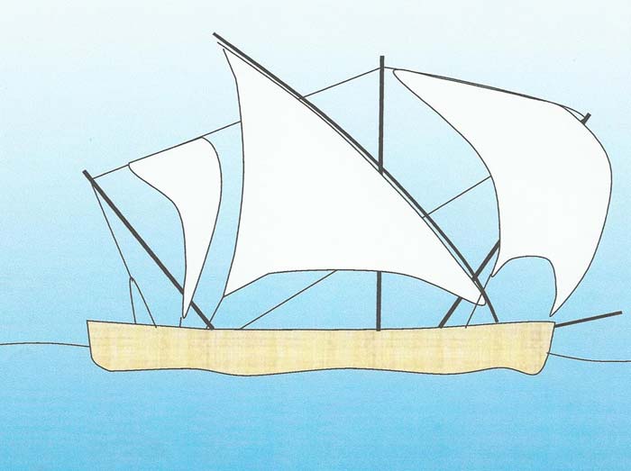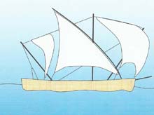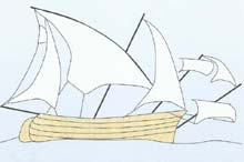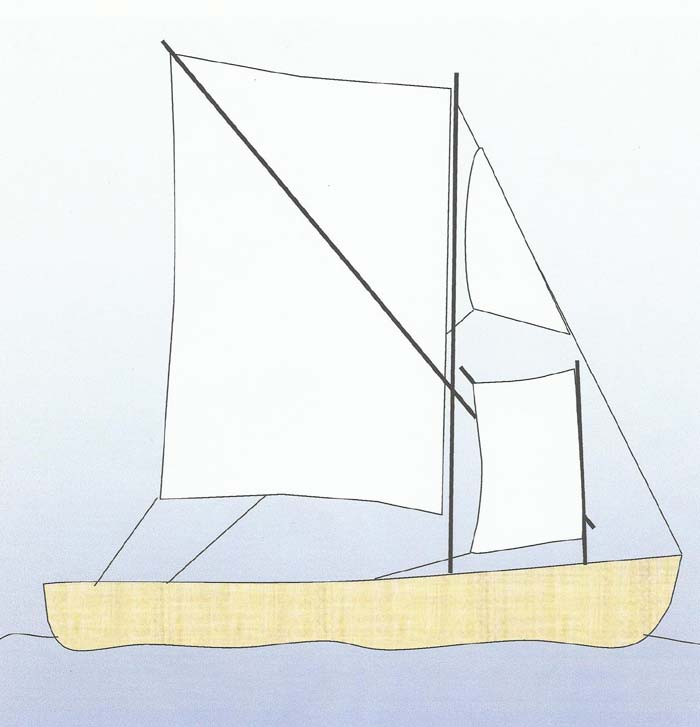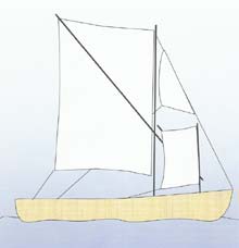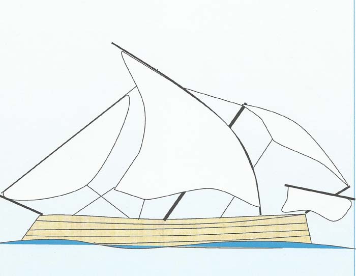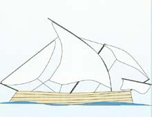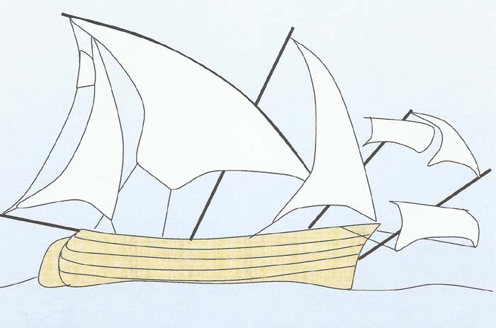 The Moletta was also a fishing boat from Portugal, where their inspiration for sail shape seems to have been diapers. There's actually only one mast here, but plenty of leaning on it. If there's an advantage to all these triangular sails it's that you could sail in the opposite direction without turning the boat around. Does the crew know which way they're going? I can't tell, but it looks like plowing downwind on a Moletta would be a hair- raising experience. Maybe the crew does the screaming, instead of the wind. If I were a fish, I'd be insulted to be caught by this boat.