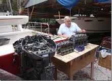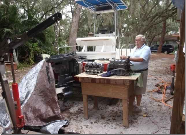Howard's 80 horse four stroke still isn't running well so instead of dumping it in the ocean like I suggested he took it apart again just to see if he could find anything wrong. Pulled pistons and then put it all back together, all in two days and the thing started right up. I still won't trust it to take me across the river and we all might chip in and buy a new engine for this boat so we can use it.