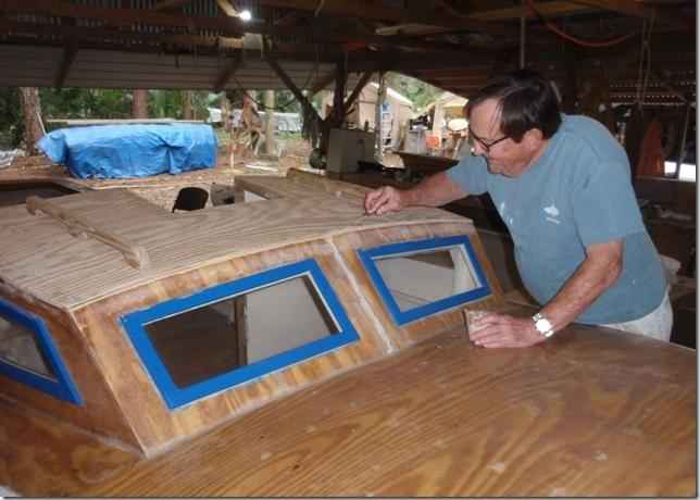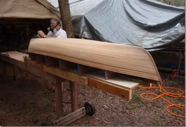 Layer of glass going on. Sandy's using cypress for the wood on the boats instead of the usual cedar. It's a little heaver, not much but easier to work with and costs a lot less.