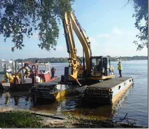 Speaking of Michelle, check out this machine crew she's working with. They need to dig a trench through a marsh for the dredger to go through and this is what they are using. Have you ever seen anything like this, a floating tracked digger.