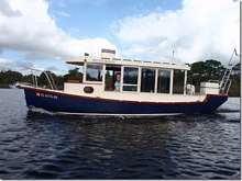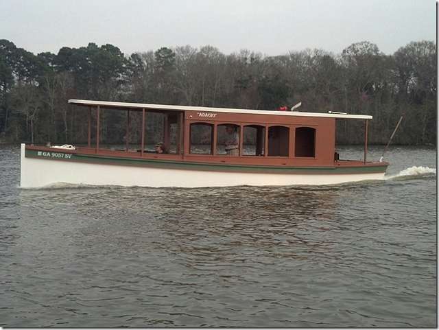 Charles Hodges did come to see us. He's from Georgia and built this launch from some modified Bolger plans. I think he said that it's 34 feet long. The truly unique thing about this boat is that he controls everything with a controller of a PlayStation. Everything has a servo running it so he can walk anywhere on the boat and still be in control. Would you imagine that he's a radio control airplane guy? He and his wife were here a couple weeks ago the same time as Chuck the Duck and Sandra. They both talked for a while, had a lot in common and left not knowing who the other really was. We get a lot of that here. If you come for a visit you may be sitting on the dock swilling beer with the king of the universe and not know it; braggarts and jerks get pushed in the water and leave.