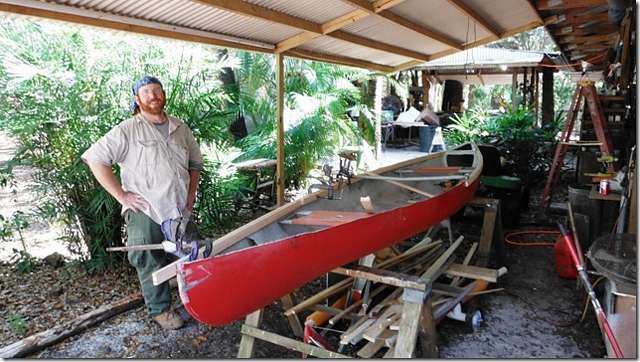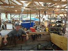 The Florida Maritime Museum had a class on building skin on frame kayaks and got Dave Gentry to teach. This is Dave himself. If you need your frame skinned Dave's your man. I took this picture two days ago, notice the weather. I only mention this because Dave came down from somewhere on the Chesapeake Bay and they were having a blizzard with a foot of snow on the ground. His wife won't let them move here because it's too hot in the summer. I love to hear that, we're getting too crowded as it is.