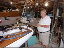 Everything ends up being "repurposed" if it comes here. This is an old Lightening sailboat hull that Wally's converting into a cabin motor boat, I jumped in to check the height of the sides. Notice that I've switched to the summer uniform. We all get really upset if anyone tries to give us any advice; and besides how the hell could you give advice on any of the strange boats taking shape here at the happy hour club. Only the builder has any idea of what it's suppose to turn into and that changes daily.