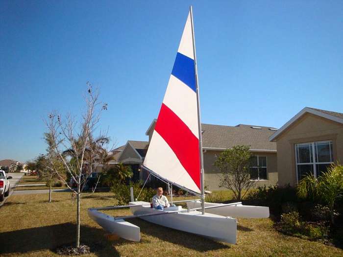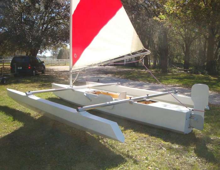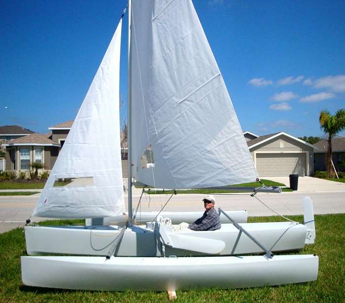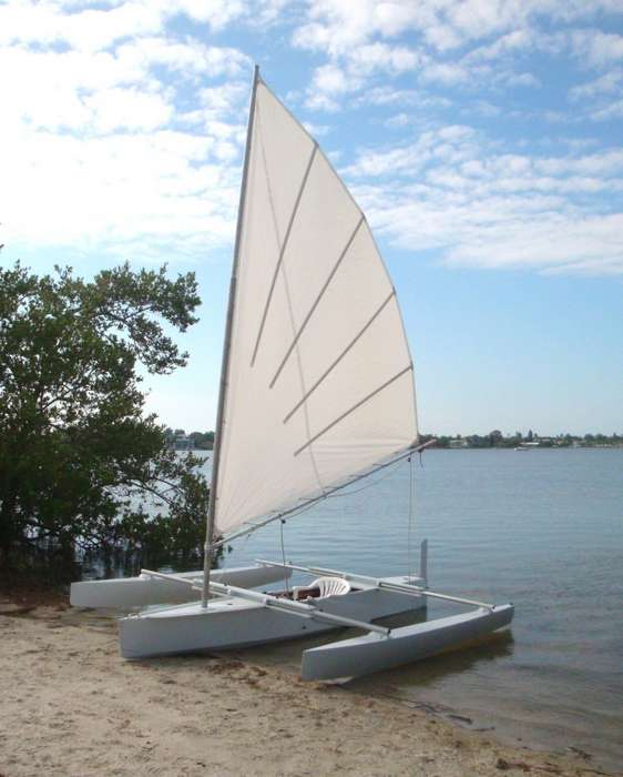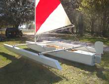 2. Building is lots of fun. Of course, I have always been building…something. I was a building contractor for much of my working life. But even today, nothing seem to make the clock disappear like an engaging building project. And what’s more engaging to build than a boat? 3. If it breaks, you can fix it! This I know from personal experience. Yep, lots of stuff I made in the early days broke -- mostly to do with the rudders. I build things lots sturdier now, but even so, if it breaks, I can fix it! 4. You get great sense of accomplishment. Building anything with your own hands is rewarding. But believe me, a trimaran is MUCH more rewarding to build than a coffee table. And the feeling of being out on the water in something you built yourself is just amazing. 5. Building keeps you off the streets and out of trouble. Well, it does that for me. Of course, if your spouse feels neglected because you spend so much time in the garage or shop, see if you can get them involved one way or another in the construction. Wife Laura is an ace epoxy mixer, and also trims the overlaps at stem and transom whenever I fiberglass a hull! 6. They cost so little to make that you can build two, and sail with a friend! That's what I did, and now my wife Laura is my very contented sailing partner -- and an incredibly competent sailor as well. (And that video of me going 12+ mph in No Commotion? Laura is the one who shot it :) Bottom line: Building your own small trimaran simply gives you the most bang for the buck! Added Note: I Am Now (Finally) Able To Offer Building Plans! Since this article was first sent to Duckworks, plans have been completed for Slingshot 16, an improved version of Laura’s Boat, as seen on my web site (www.DIY-Tris.com) After not being able to fulfill the many requests for plans for Laura’s Boat, I teamed up with CAD whiz Andrew Walters and am now proud to offer what I believe to be some truly first-class building plans. If you have any interest in building a quick and nimble small trimaran, you can get full plans for Slingshot 16 here at Duckworks. And if you’d like FREE study plans for Slingshot 16, simply send me an email here with “FREE Study Plans” in the subject line, and I’ll get them right out to you! Here’s a video of one of my first small tris, No Commotion. Happy sailing, “Trimaran” Frank