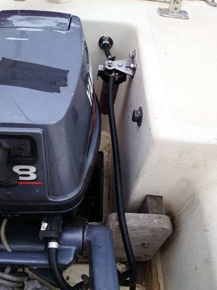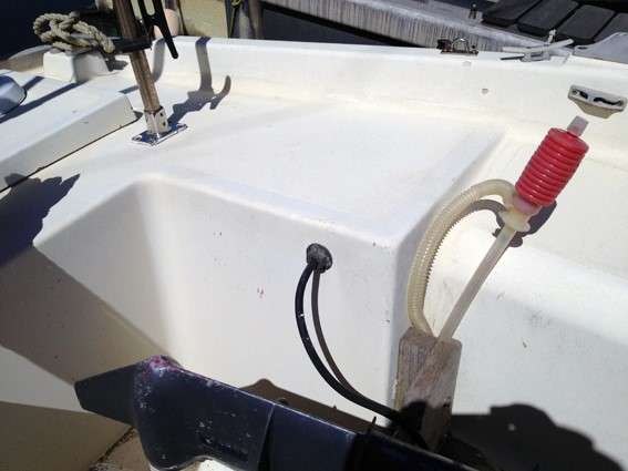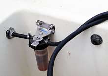 Solution: fit a fuel filter that's designed to remove water between the fuel tank, which is in a special vented stern locker, and the outboard, which sits in a well at the aft end of the cockpit.