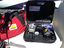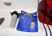 The fuel filter, extra filter element, hand-sewn tool bag. |