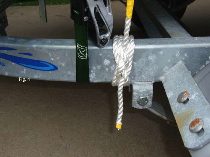 First step as shown in Fig. 4 is to “anchor” the line to the port side of the trailer. A boom hitch is used to “anchor” the first line to the port side of the trailer. The boom hitch is the Cadillac of hitches and is very secure. Although the boom hitch is more complex to tie than many other hitches, I only have to tie this hitch once, because I will leave this boom hitch in place when the boat is off the trailer.