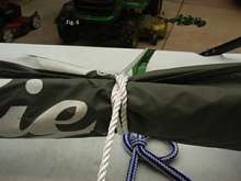 Fig. 18 shows the mast secured to the boat in a nice tidy package. Note I’ve used two lines, fore and aft, to secure the mast. Both lines are tied the same way using the ratcheting truckers hitch. Both lines are secured around the sail bag using a clove hitch. The two lines are drum tight. The sail cannot move side to side, up or down, or fore and aft. When I put the boat in the water, all I have to do is release the clove hitch on the starboard side of the trailer, release the ratchet knot, and remove the clove hitch from around the sail bag. I leave the bowline in place and leave the boom hitch tied to the port side of the trailer. Then, putting the mast back on the boat goes very fast.