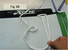 Fig. 5. I used the step by step instruction sheet in Fig. 5 to help me tie the boom hitch. Fig. 5 is upside down, but that’s how I want it. I flipped the instruction sheet upside down so that the hitch shown in the guide is in the same orientation as the way the line runs on my boat.