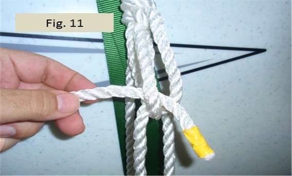 Fig. 10 shows the first stage of forming the modified garda hitch. The working end is led from the bowline knot down around the trailer and then back up to the bowline knot to be fed through both rope loops. Our plan to complete the garda htich is as follows. Before leading the working end back down to the trailer a second time to be tied off as occurs in a conventional truckers hitch, we’ll first feed and wrap the line through the bowline one more time. But instead of feeding through both loops as shown in Fig. 10, the second time we’ll bring the working end down between the two bowline loops as shown in Fig. 11.