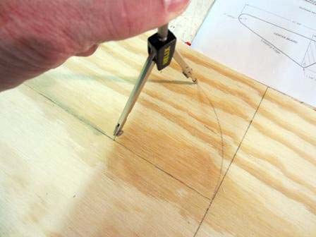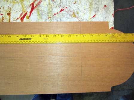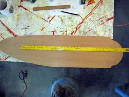 10. Draw out the "flat" area on both sides of the board. First measure and draw a line across the board 8" from the head end. From this 8" line, draw a line 5" from the trailing edge and 3" from the leading edge. The length of the 5" line is 23 ½" and the length of the 3" line is 24 ½". Draw a curved line from the end of the 3" to the end of the 5" line.