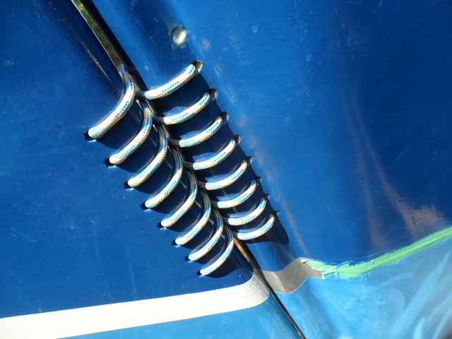 The beauty of this method, as Tom explained it, was that there is no chafe on the lashings, the top end could be epoxied into the hole and the bottom end made fast so that tightening could be done at any time. He was still pondering how to make the free end fast, see the last paragraph of this article, when I spoke with him. He did say that as far as he could tell once pulled taut the lashing didn't seem to move even with movement of the rudder.