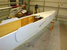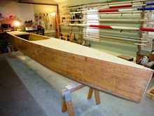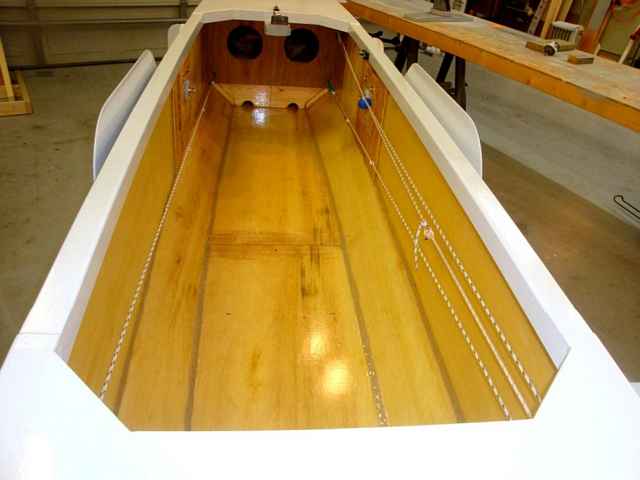 All of this brings me to introduce to you my latest trimaran creation: a 19-footer with a 14’ maximum beam and 18’ outriggers, or “amas” (as we trimariners like to call them). Here are a few late-stage construction photos that show just how lightly built this boat is.