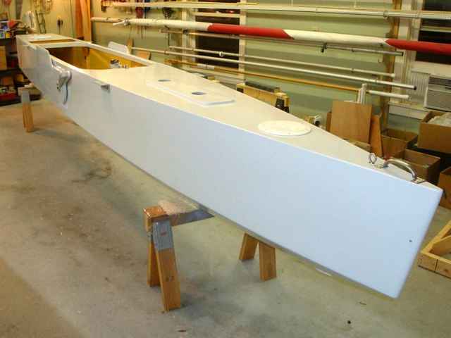 One aspect of this trimaran design that is (as far as I know) unique, is that it has a sliding “main” seat that allows the boat to be perfectly balanced whether sailing solo or with a friend. This was not the easiest thing in a boat with foot-pedal steering, so I had to devise a sliding seat on a track that also included the steering pedals.