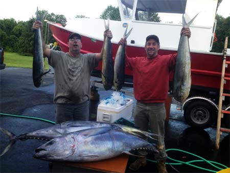 We took the skiff offshore of Ocean city Md this weekend. Ran it to Poormans and Washington Canyon about 60 nm off the beach. Total run was 227 miles in 30 hrs trolling two days. Ended up with two Yellowfin tuna to 50 lbs and 9 mahi mahi to about 10 lbs. Nice trip. Averaged 3.5 nmpg.
