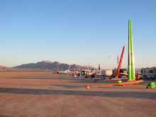 The next morning can only produce teaser puffs, so the DRZ gets fired up, and the search for adventure takes me into the surrounding hills. A small peak gets bagged, a couple of desert tortoise biologists get met, and I arrive at the dirt track behind the big casino just in time to see one of the thousand horsepower offroad race trucks practicing there, go up in smoke. I hang around the semis for an hour chatting with the mechanics, til I hear lunch calling. The afternoon is filled with camp hopping, wrenching, reading, and a little guitar, as the breeze is on holiday. The MOOSE men (my club) from Montana put on the evening feed, the stars are as entertaining as ever, and the weather predictions are still promising a big blow, so all the wings and masts come down, and loose items are secured. As we all retire, it starts to ramp up, and I start to get a little giddy.