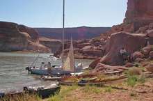 The Leinweber family were in three homebuilt Michalak kayaks, well-suited to the task. Hal Link was in a very sleek Kevlar sea kayak. Dad and daughter Paul and Cathy Cook were in a canoe. Long-time Kokopelli veteran Tom Gale was there with four teenagers, two of his own, plus two friends to keep them company. They came all the way from Washington State with a small fleet in tow: an 18 foot pocket cruiser sailboat plus a tandem kayak and one of Jim Thayer's line of small sailboats.