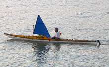 Our second night's campsite was rejected on the first pass, but then we found only worse options beyond, so we returned and made the best of a rocky, sloped site. I found what seemed like the only near-flat place in the area to pitch my small tent, at the price of a steep, uphill walk from the water's edge. As evening drew near, Hal entertained us, by claiming he could build a sail rig for his kayak with a few bits of wood, a piece of a plastic tarp, and a roll of duct tape, which he had brought along. We were skeptical. Then, in a matter of minutes, he did it, he installed it on the kayak and he pushed off for a test. With barely any breeze, and only a tiny sail area, the results were modest, but it worked, sort of, and the skeptics were silenced.