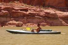 Day 6. We arose in the dark about 4:30 am, with no hint of dawn yet in the east. I was determined to be the first away. I said my farewells to my companions about 5:00, with just enough light to get pointed down the middle of the lake, knowing that the light would be increasing by the minute. Rather than sticking together as usual, I was determined to be on the road home by mid-day, so I struck out on my own. The first part of the journey was a rare, straight, eight mile section of the lake, which enabled me to steer a course, looking astern at the silhouette of rocky peaks against the pre-dawn glow. Five days at the oars seemed to have toughened up my back a bit, because the discomfort was gone. Instead of the expected ordeal, the early morning row was cool, peaceful and quiet, except for the gentle "thunk" of the oarlocks and splash of the blades. It was beautiful and inspiring. I rowed for about two hours before the sun finally cleared the canyon walls, and put me back in the unwelcome heat again, by which time I was well out of sight of our group. Power boat traffic reappeared, and the magic spell was broken. In another hour and a half, I was unloading my gear at the launching beach, just as most of Lake Powell was beginning to stir. Later in the day, on my homeward drive, I felt the fatigue of an early start and a near-nonstop row of 15 miles, but at that moment, all I felt was satisfaction at the close of another chapter in my unfinished book of Lake Powell experiences. Thanks again, Jim.