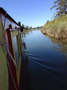 For lunch on day two I tied up to a piling, Mediterranean style, one end tied to the piling and the other held in place with an anchor. The helps keep the solar oven lined up. You can't really step out on shore, as the mud is very deep. You can only get out at high tide, when you can step onto the grasses.