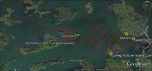 Trapped ashore at the northern edge of Dead Dog Bog. The "islands" outlined in red are the floating bogs described later in the story. An extremely strong southerly wind has us pinned down, unable to make windward progress. |