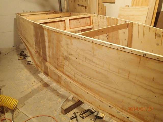 Interior panels are all fully glassed and filleted. Next boat project will use better plywood that doesn't require fiberglass on interior panels. Cabin decks and slot-top beams are roughed on. |