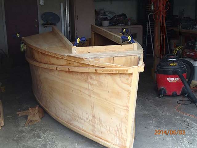 Starting to look like boat. Frames and sides assembled with deck screws. Next step is to glue each bulkhead permanently. Will coat bulkheads with epoxy and 4oz fiberglass to prevent plywood checking. |
