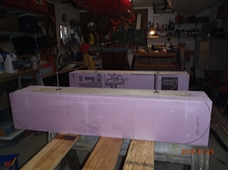 I'm putting together a yawl sailing canoe. I've chosen a Grumman 17 as the canoe, but that could change. Currently I'm building outriggers and struts. The outriggers are 48 x 8 x 10 inches and will have two struts, kerf cut to provide some angle off the water. I'm basically following the Solway outrigger design. I'm using a high density foam panel of insulation 2 x 4 8 x 96 inches you can purchase at Home Depot. From the foam I cut 8 panels 10 inches wide by 48 inches long, these are glued together to form a rectangular box.