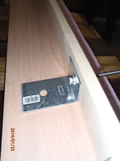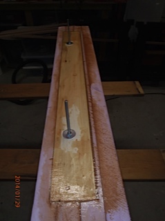 Shows the strong back 1/2" oak board cut to 3" with L brackets/bolt/locknut, fender washer low profile nut on top. Top view of outrigger strong back with studs installed.