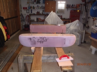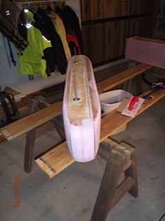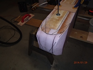 Shows blocks glued/strong back epoxied in place and lines for cutting bow shape (used 3.5 gal bucket lid).