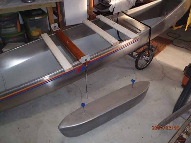 Leeboards will be centered on the hull, the white board represents the aft pontoon strut, the forward strut is just visible. There is room to install a thwart for a mizzen, which I'm still contemplating. I have two bermuda sails I could install and/or use the Sherpa lug with the bermuda mizzen.