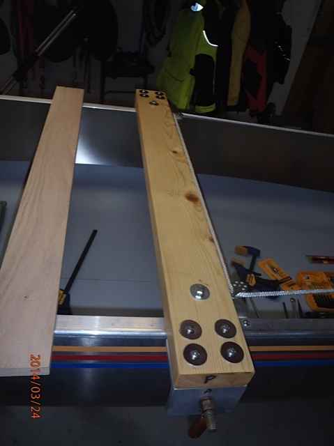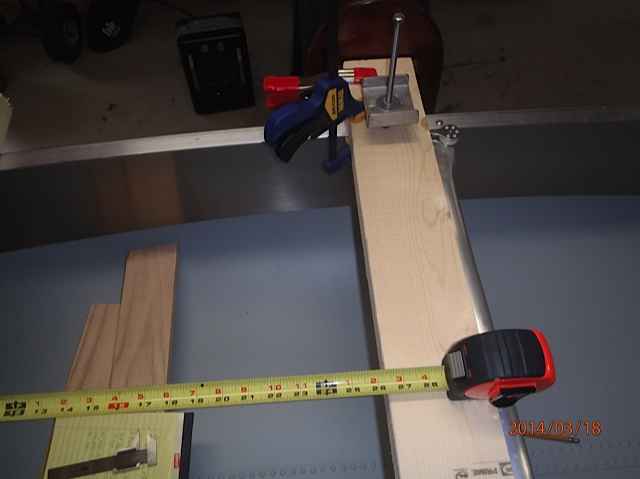 This is the oak 1x4 strut for attaching my two pontoons (I call them toons for short). I originally planned to use two struts, but the toons only weigh 11lbs each and a single strut should be strong enough. For good measure I will add a 1x2 screwed and epoxied strong back to this strut. The measurement of 5 inches is the distance forward of the leeboards this strut will be located (thru bolted to the railing). We need 5 inches clearance for the leeboards to rotate up and down.