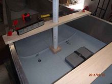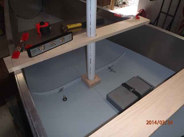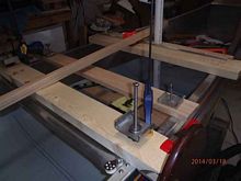 Using a wood mast step and a 1 1/2" PVC pipe for aligning, you can see the thwart placement. There is another option for the mast step, removing six keel rivets and having a step fabricated to bolt in place. The advantage of using a bolt in step is it can be removed and/or relocated by removing rivets and thru-bolting to the keel. The obvious disadvantage of marietexing the step in place, it's extremely difficult to remove. I'm undecided which I want to use. The mast thwart is 1x4 oak, although I have a section of 2x6 spruce which would match the leeboard thwart. The 1x4 oak middle board represents the location of the pontoon strut.
