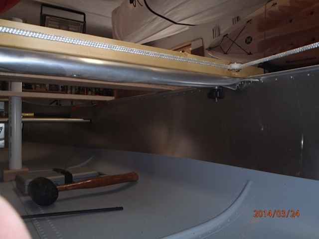 I have the oak thwart with the hole drilled for the mast. I used a 2" pvc pipe to measure and fit for plumb. Remember to level the canoe before you do this step. Since I'm using a balanced lug I want the mast straight up and down. Note the 2x6 just behind the oak 1x4 thwart. I may use it and drill the mast hole close to the forward part of the 2x6 thwart. The wider thwart would provide a location for installing rigging hardware and a place to set drinks/eats if we decide to have lunch aboard. The mast tab will be located flush with the edge of the rib and be about 3 1/2 inches long and 2 1/2 inches wide. Six rivets will be removed to install the tab, the actual tubular mast step will be thru bolted to this tab. The advantage of this arrangement is you can remove the mast step for using the canoe without the sailing rig. It's not necessary as you could leave the step in place, which I'll like do.