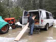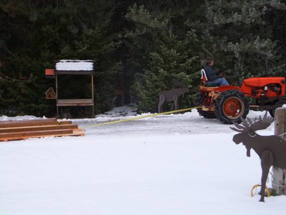 Little Alice needed a home. This is a problem. What's to do with 3,500 pounds of steel and cast iron nearly as old as I am? Kate's "suggestion" was to "hide her in the trees." OK. So, instead of getting back to boatstuff, as scheduled. I built a bridge out of very heavy and very frozen 2x12's and 4x4's. I skidded the assembly off across the snow, across the ditch, and into place. I cut down a really big tree and cleared a space to erect Little Alice's winter shelter. And, pretty much like I build boats. I discovered that I had overlooked a significant issue. It's just not gonna' work as planned. Soooooo, another couple days got dissolved in erecting a compromise shelter (unfortunately in front of the window in her sewing room). So it goes.